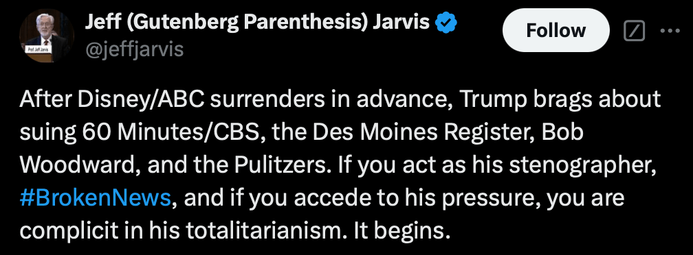 On Twitter/X, Jeff Jarvis, author and journalist, issued a warning: